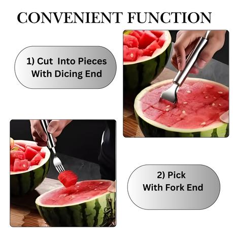 Strong 2 piece silver dual-head watermenlon cutter with cutting and fork end for convienient cutting and picking up of watermelon. Made of Stainless Steel and can be used in the kitchen and outdoors. Features: – Dual-Function Stainless Steel Watermelon Tool: This innovative utensil combines a slicer and fork in one, allowing you to effortlessly cut…