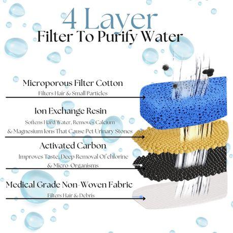 4 Layers Filtration for Pet Health: Water will be filtered by a blue pre-filter cotton firstly, then by Ion Exchange Resin, an activated carbon filter and medical grade no-woven fabric again, so the water fountain can provide your pet with pure drinking water, preventing limescale and dirt building up.