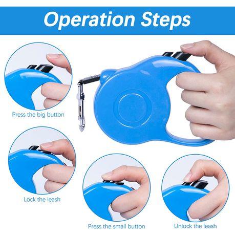 Safety for Usage: If you want to lock/unlock: you simply push the button down and pull back just a bit, and the leash will lock. If you want to just stop the dog for a second, you simply push the button to stop the retractable feature, If you want to unlock it, push the big button forward; Do not let your dog chewing the leash; If your dog likes to chew on the leash, you will need to equip the leash with a bite proof chain; Do not fully release the leash when the dog rush forward, the strong impact will damage the spring and internal accessories: It needs to be locked in time.