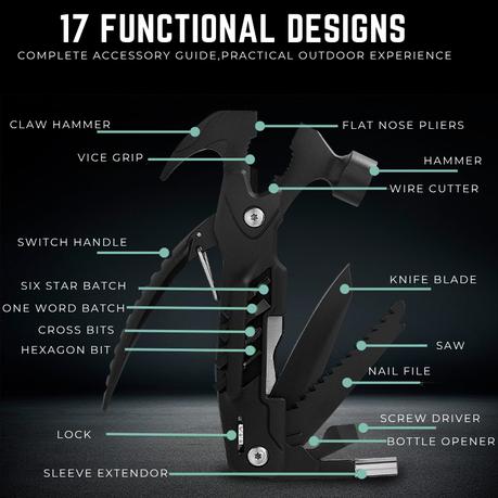 - Functions: 17-in-1 (Hammer, Knife, Pliers, Screwdrivers, Cutter, etc.)