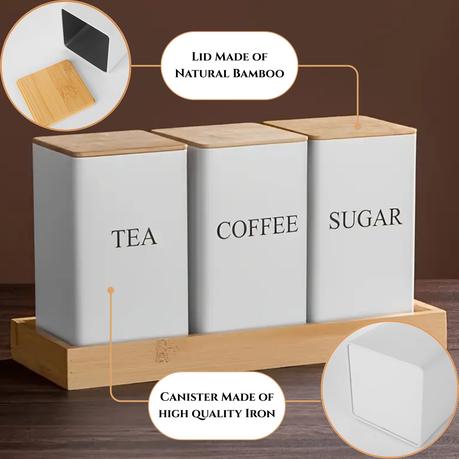 Bestby -3-Pcs Canister Set ,Tea, Coffee, Sugar Jars with Bamboo Lid & Tray – White