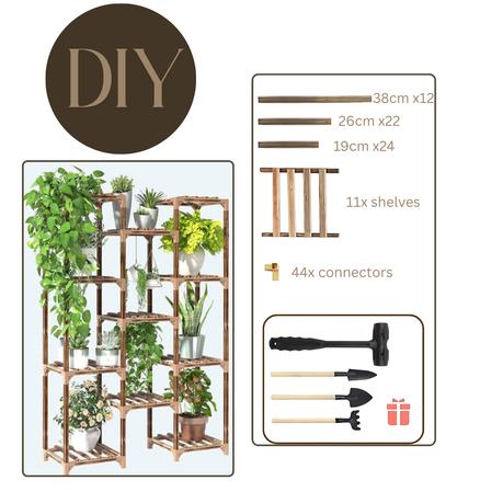 Tool-free wooden plant stand made from eco-friendly eucalyptus. Sturdy, modular design with accessories included. Easily adjustable layout perfect for indoor or balcony plant displays