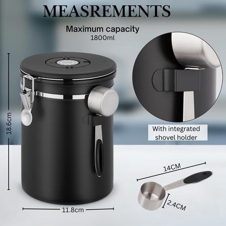 – Large Capacity Storage: Generously sized canister holds up to 1.8L / 1800g of coffee beans , Includes a measuring spoon for easy scooping of beans or ground coffee