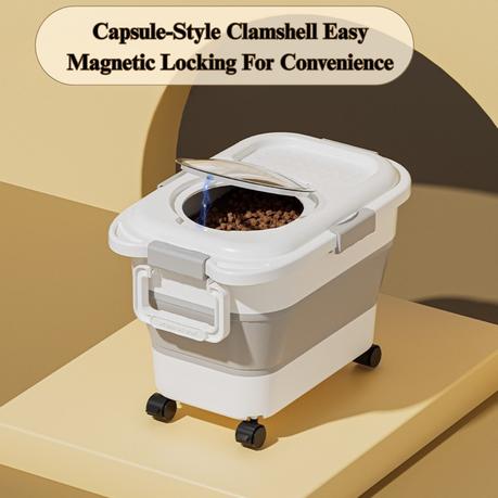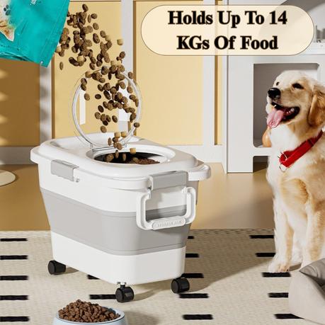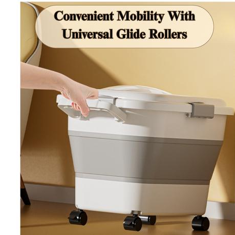 Collapsible and Space-Saving Design: Measuring 45L × 29W × 27cmH, this container can hold up to 14kg of dry food. When not in use, simply press to fold it flat for compact storage. Four smooth-rolling wheels on the base make it easy to move around or transport during travel.