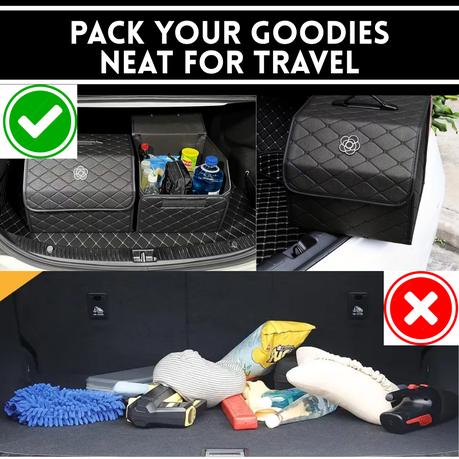 This premium car trunk storage case is the perfect solution for keeping your vehicle tidy and clutter-free. Designed with a luxurious quilted leather finish, it not only enhances the interior look of your car but also provides practical storage for all your travel essentials. It allows you to neatly organize bottles, groceries, cleaning supplies, tools, and emergency items, ensuring that nothing rolls around while you drive. Its foldable and lightweight design makes it easy to carry and store when not in use, while the sturdy handle adds extra convenience.
